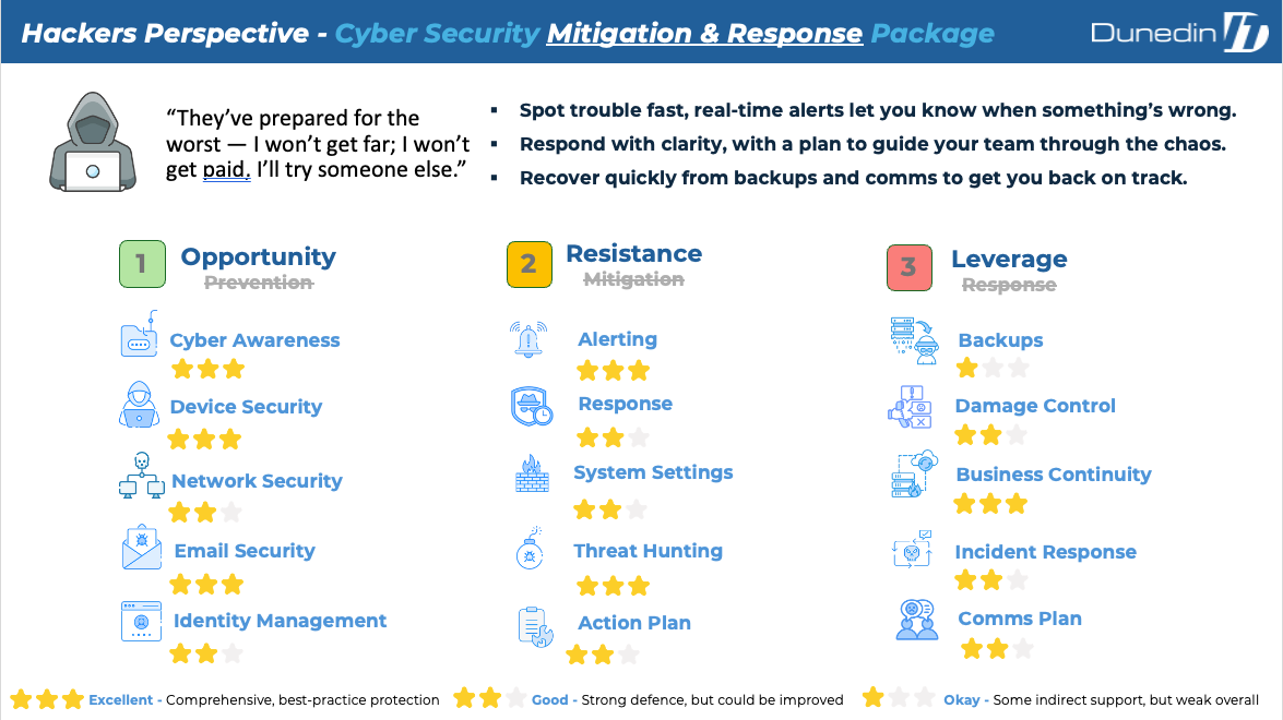 Mitigation & Response is designed around a reality SMEs face: even well-run organisations can still get hit. This package is about minimising damage — spotting trouble early, acting decisively, restoring operations quickly, and keeping customers and stakeholders informed. It aims to remove panic from the situation and replace it with a plan.